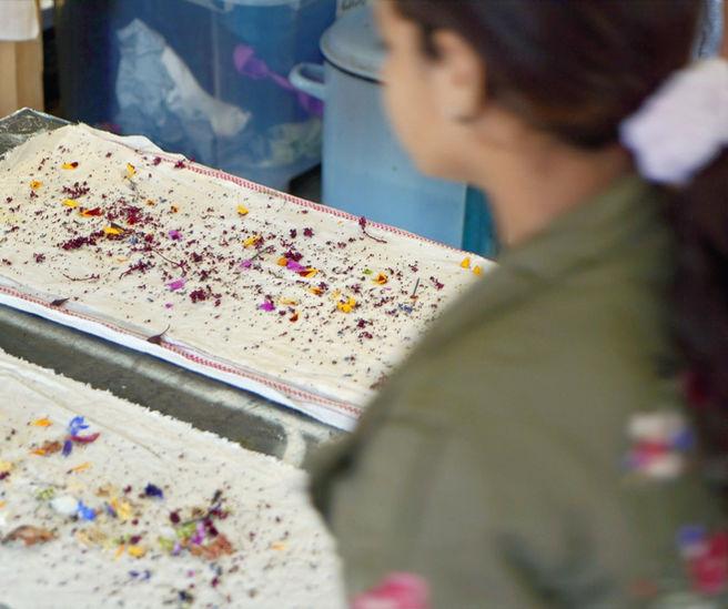 Beim Eco-Printing entstehen lebendige, von der Natur geprägte Muster. Blätter und Blüten hinterlassen ihre natürlichen Farben und Strukturen direkt auf dem Stoff. Der Moment des Öffnens ist jedes Mal eine kleine Überraschung – jedes Stück wird zu einem einzigartigen Naturdruck.